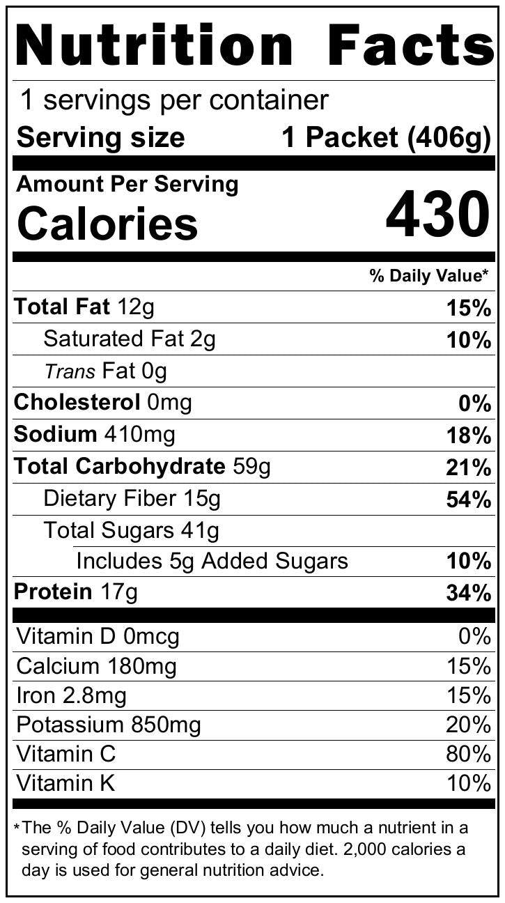 Mixed Berries, Banana, Cauliflower, Zucchini, Mango, Greek Yogurt (Cultured Milk), Walnuts, Hemp Seeds, Ground Flaxseed, Medjool Date, Chia Seeds, Cacao Nibs, Cinnamon, Sea Salt.